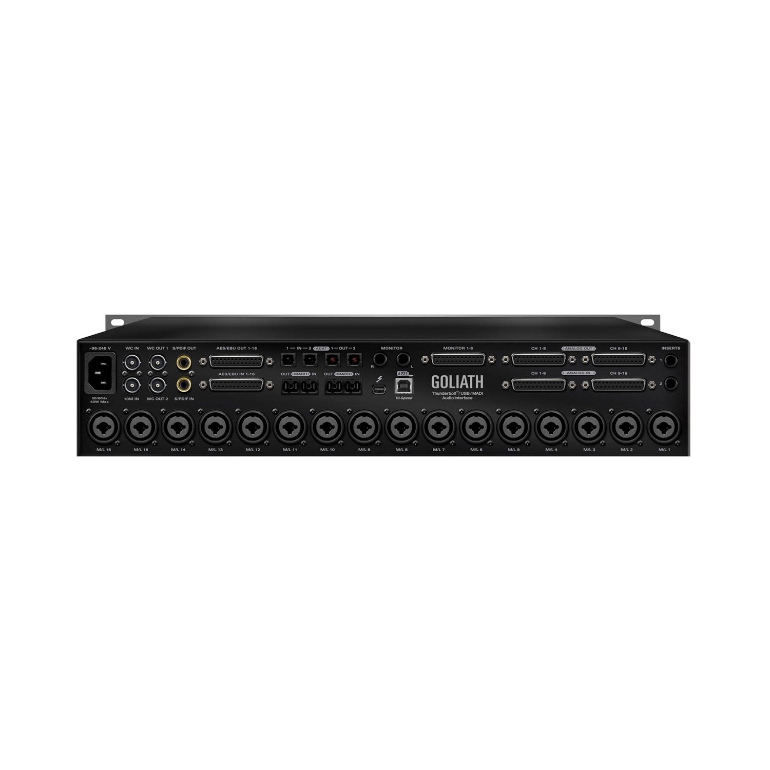 Connectable via blazing-fast Thunderbolt™, USB & 2 x MADI, Goliath houses a total of 36 analog ins and 32 analog outs, providing digital clarity and analog realism like no other audio interface out there.